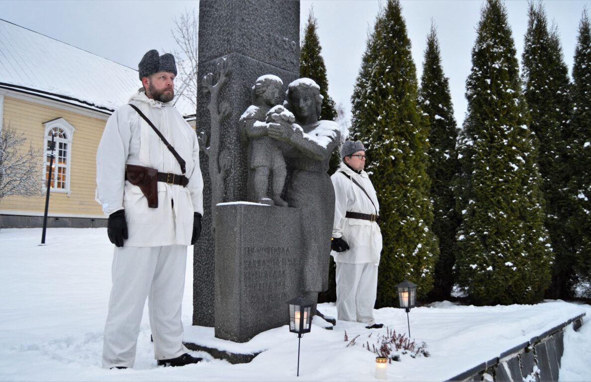 Kuvassa kunniavartio sankariristin luona.